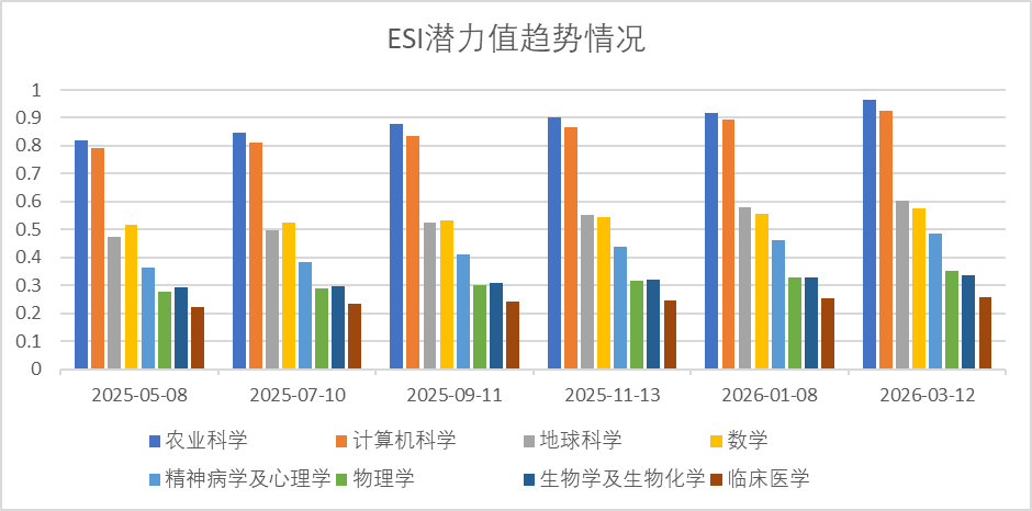 本期农业科学ESI论文241篇,总被引3679次,进入ESI前1%阈值为3808,比值0.966;计算机科学ESI论文363篇,总被引5418次,进入ESI前1%阈值为5853,比值0.926;地球科学ESI论文274篇,总被引3834次,进入ESI前1%阈值为6347,比值0.604;数学ESI论文715篇,总被引3143次,进入ESI前1%阈值为5478,比值0.574;精神病学及心理学ESI论文216篇,总被引2175次,进入ESI前1%阈值为4495,比值0.484;物理学ESI论文544篇,总被引6759次,进入ESI前1%阈值为19277,比值0.351;生物学及生物化学ESI论文205篇,总被引2549次,进入ESI前1%阈值为7603,比值0.335;临床医学ESI论文83篇,总被引1175次,进入ESI前1%阈值为4541,比值0.259。潜力学科ESI潜力值趋势情况分析见图1。