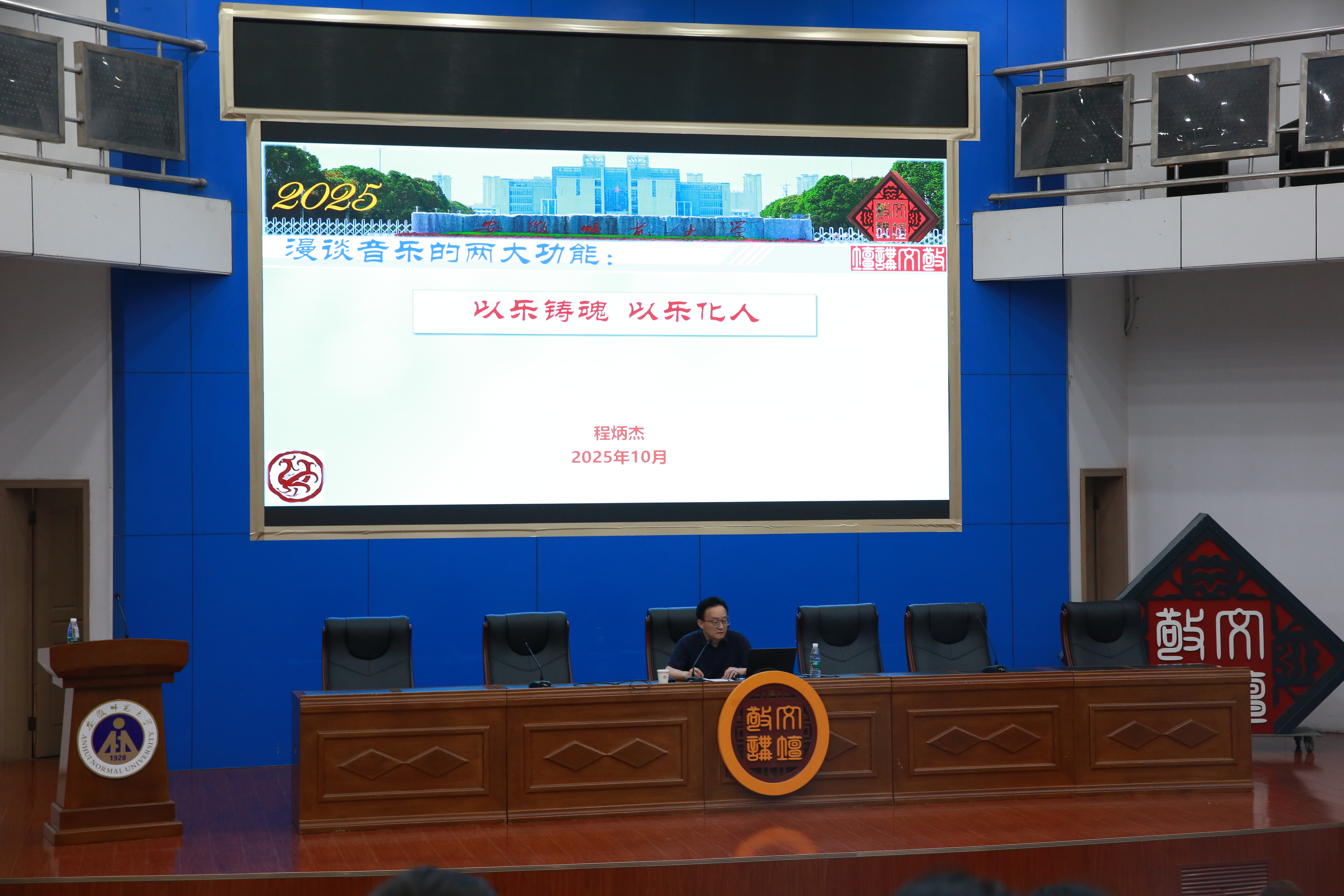 程炳杰以“铸魂”与“化人”两大音乐的功能为主线,从中共中央对文艺工作总体要求切入,系统梳理了文化、艺术和音乐三者的内涵及其内在联系。他结合古今中外丰富而鲜活的音乐作品,生动论证了“音乐史体现了文化史”“音乐以独特方式反映社会”两大观点,勾勒出“以乐铸魂,以乐化人”的音乐画卷。讲座过程中,程炳杰带领在场师生体验经典,选取文人音乐、民间音乐、庆典音乐和多元音乐中的经典音乐艺术作品进行赏析,用音乐为与会人员带来一场别开生面的心灵滋养。最后,他列举出独具特色的安徽地方文化,强调要真正做到将马克思主义同中华优秀传统文化相结合,并寄语青年学子响应时代号召,为建设中国式现代化挺膺担当。