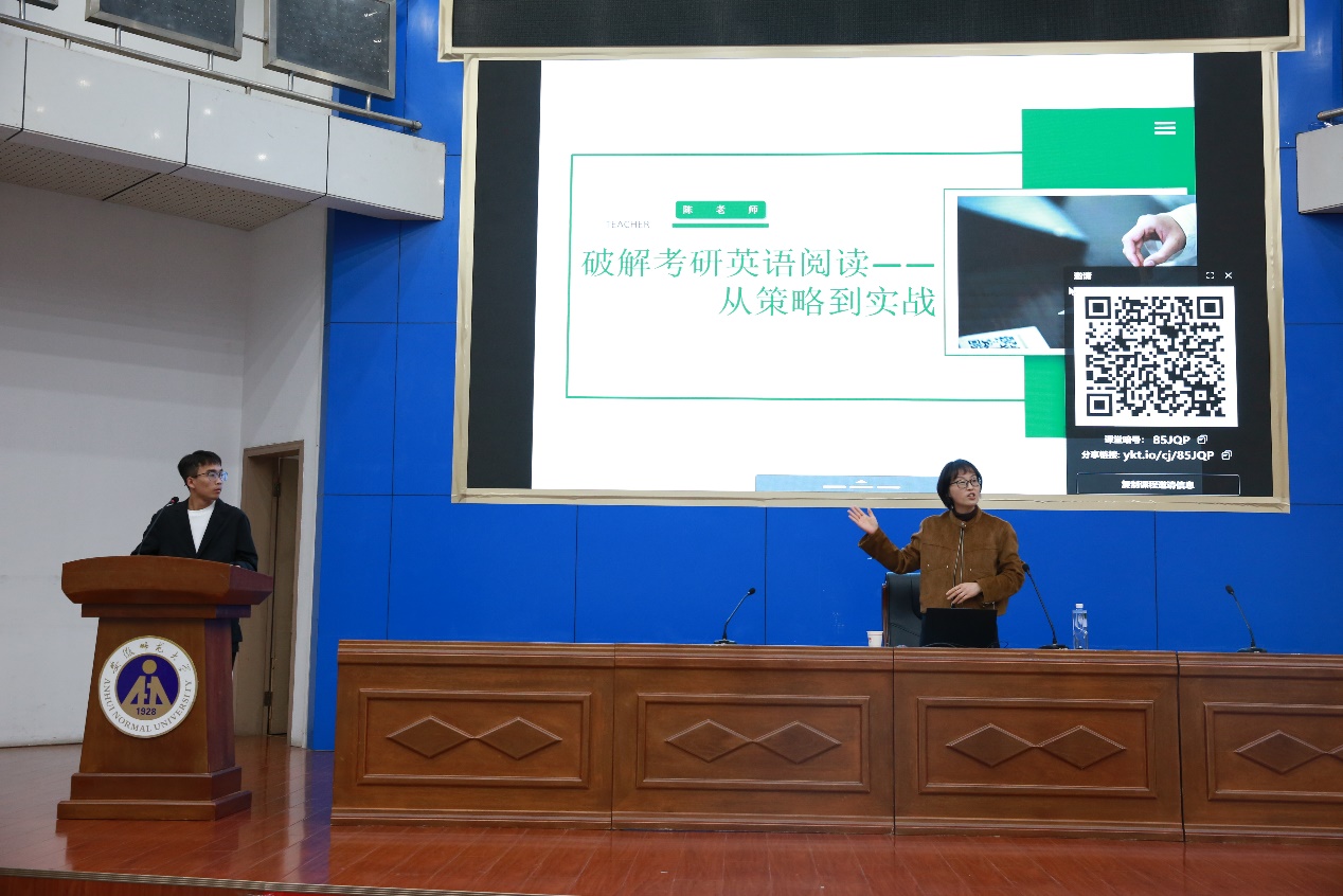 本网讯(文/鲁梦萍 董永飞 图/李毅)为助力学子攻克考研英语阅读难关,10月29日下午,图书馆联合外国语学院在敬文图书馆一楼国际学术交流中心举办“数字资源服务进学院系列活动”(总第52期)专题培训讲座。本次讲座以“破解考研英语阅读——从策略到实战”为主题,特邀拥有二十余年从教经验的陈丽丽老师担任主讲,参考咨询部学生助理李超主持活动,备考学子踊跃参与。