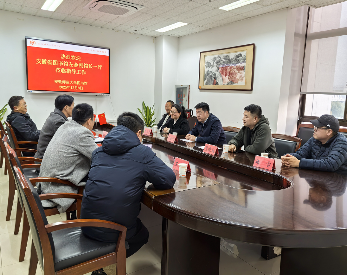 12月8日下午,安徽省古籍保护中心主任、安徽省图书馆党委书记、馆长左金刚一行5人莅临我馆,就古籍保护工作进行深入交流与指导。座谈会在敬文图书馆二楼会议室举行,图书馆党总支书记姜长付主持,副馆长刘和文、王波涛以及古籍部主任董家魁、办公室主任王伟参加。