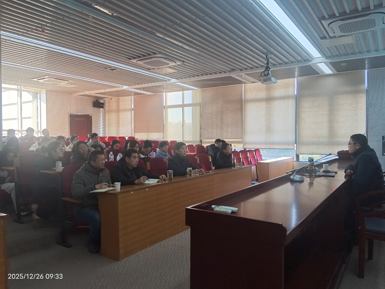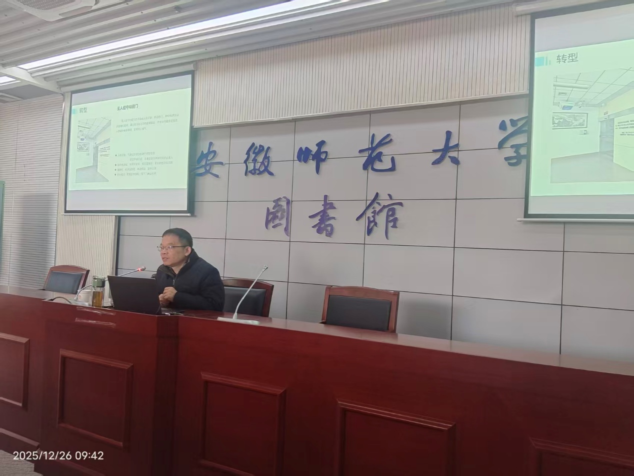 2025年12月26日上午,图书情报学术讲座2025年第九讲(总第四十四期)在图书馆一楼视听阅览室顺利举行。图书馆副馆长刘翔应邀作题为“走出图书馆——从学科服务到产业服务”的专题讲座。图书馆领导班子、部分教职工及图书情报专业研究生参加了此次交流。