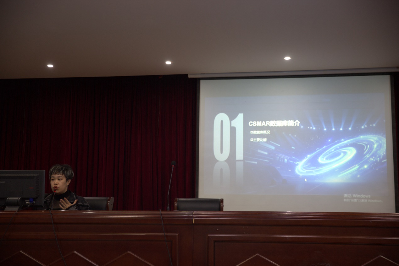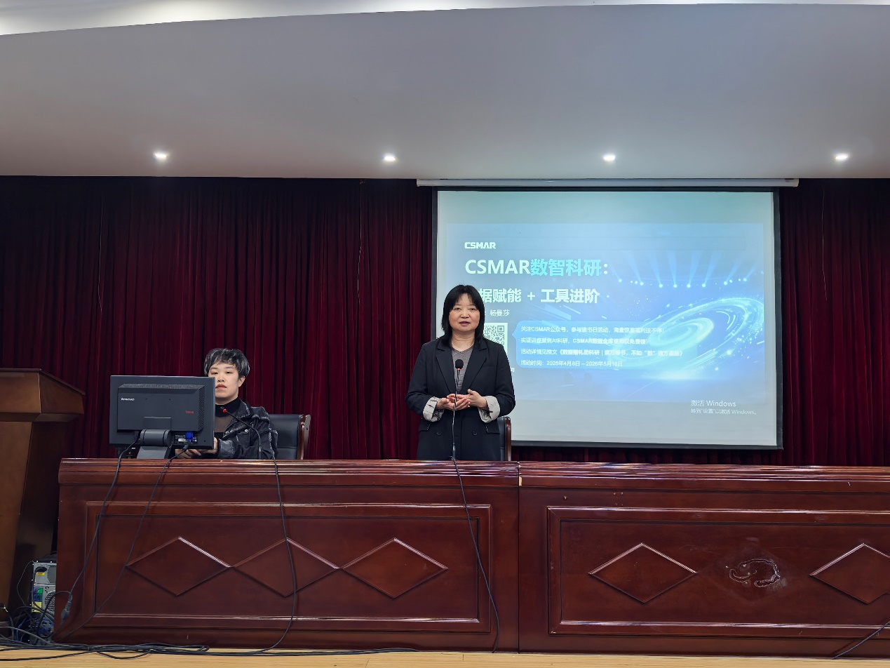 (本网讯 文/李毅 图/周欣雨 李毅)CSMAR数据库作为中国经济金融研究领域的高精准研究型工具,是助力高校师生开展实证研究与量化分析的重要数据平台。4月14日下午,图书馆联合经济管理学院在赭山校区图书馆报告厅举办“数字资源服务进学院系列活动”(总第55期)专题培训讲座。本次讲座以“CSMAR数智科研:数据赋能+工具进阶”为主题,特邀深圳希施玛数据科技有限公司高级研究员杨曼莎担任主讲,经济管理学院副教授、金融专硕学位点负责人、硕士生导师钱瑞梅主持活动,经济管理学院近百名本科生和研究生到场聆听。