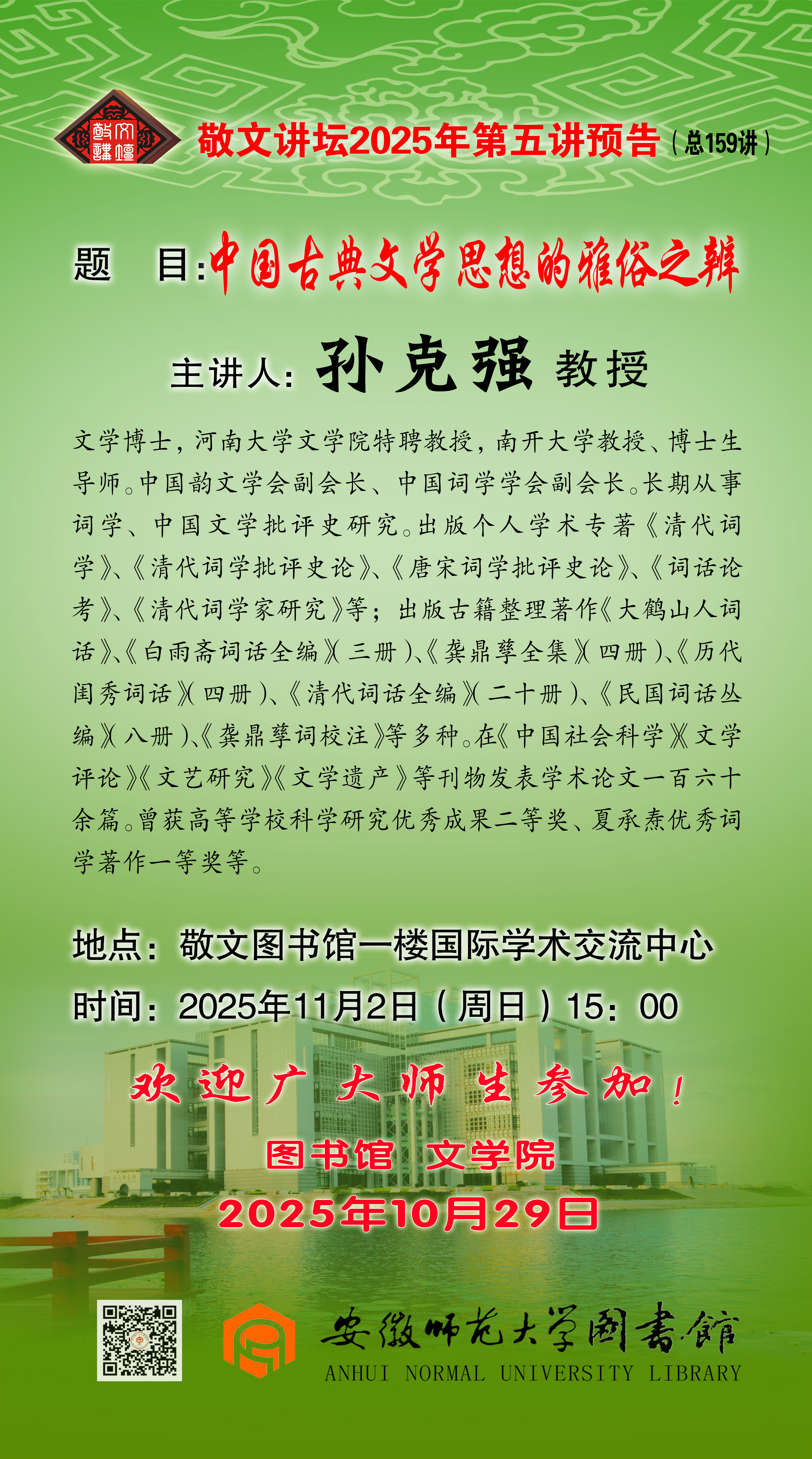 敬文讲坛2025年第五讲(总第159讲)预告:中国古典文学思想的雅俗之辨