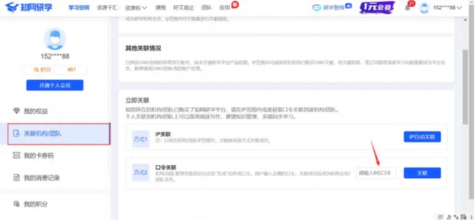 (2)点击左侧“关联机构/团队” ,选择口令关联 ,输入6位口令(NJ38VS) ,点击“关联”(请勿使用IP绑定)。