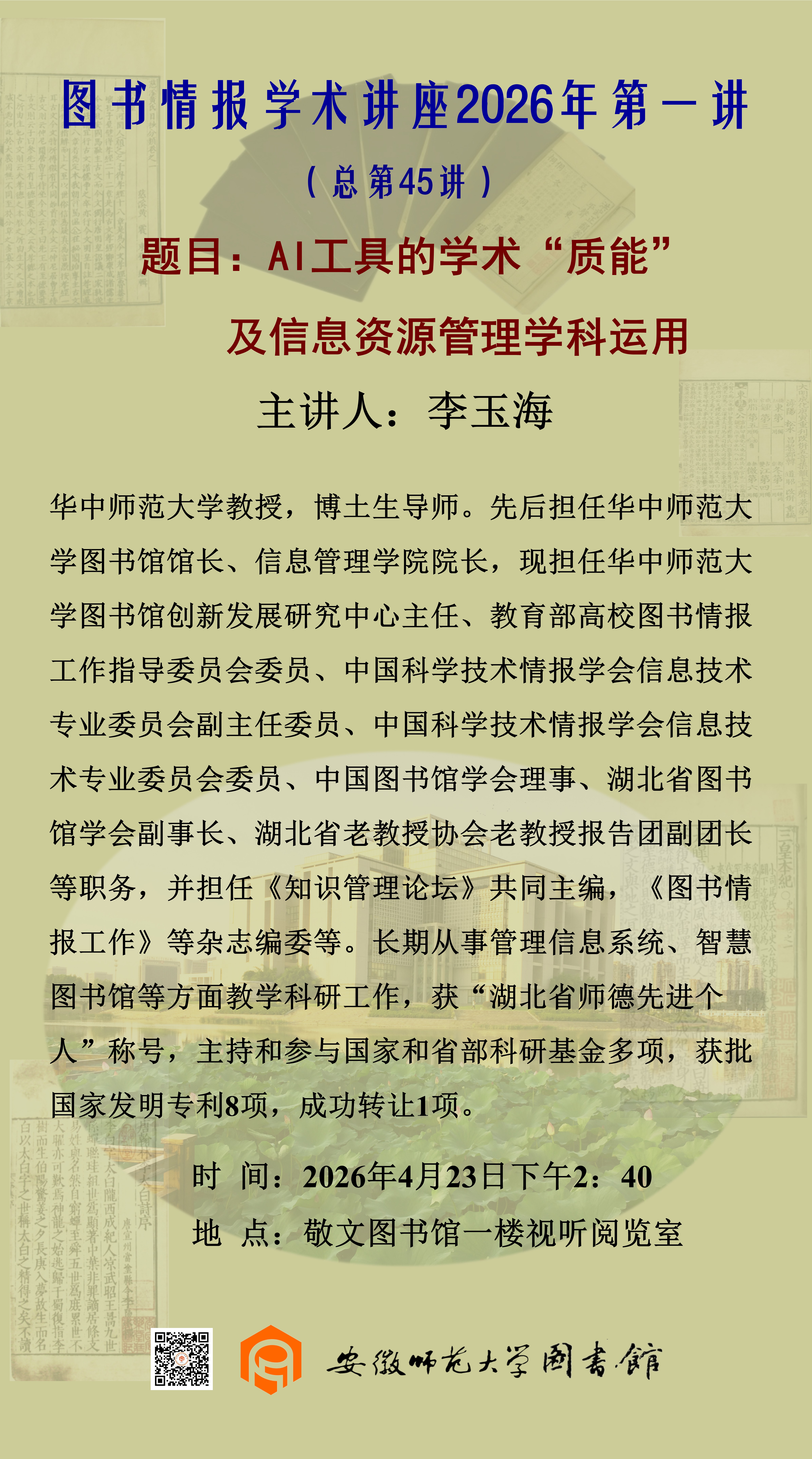 图书情报学术讲座2026年第一讲(总第45讲)预告:AI工具的学术“质能”及信息资源管理学科运用
